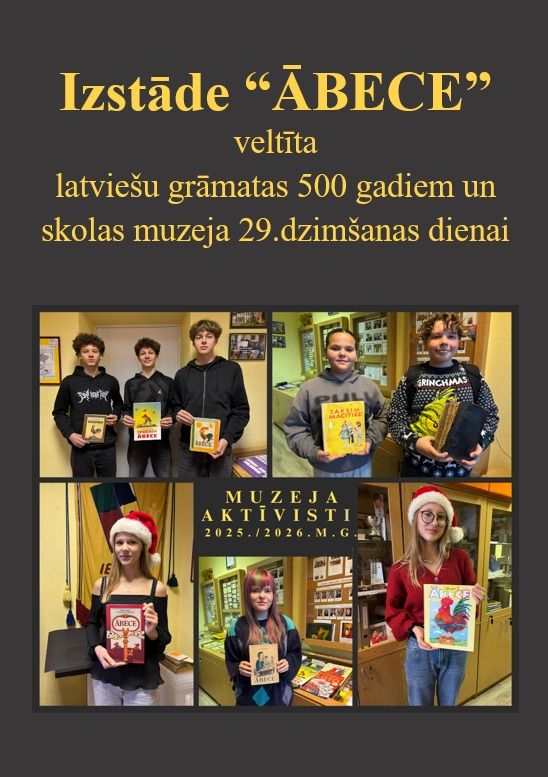 7.decembrī ir skolas muzeja 29.dzimšanas diena, tradicionāli to atzīmējam ar izstādi skolas vestibilā. Šogad tā veltīta latviešu grāmatas 500 gadiem un ĀBECEI kā atslēgai uz