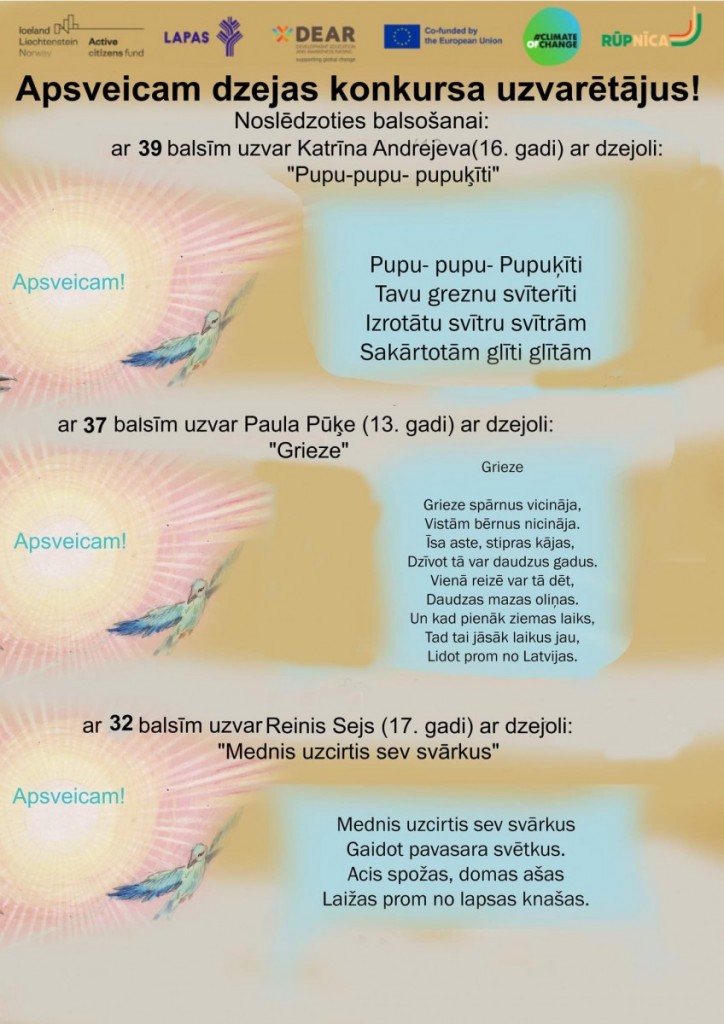 Sveicam laimīgos konkursa uzvarētājus! Konkursa organizatori ar jums sazināsies par balvu saņemšanu.