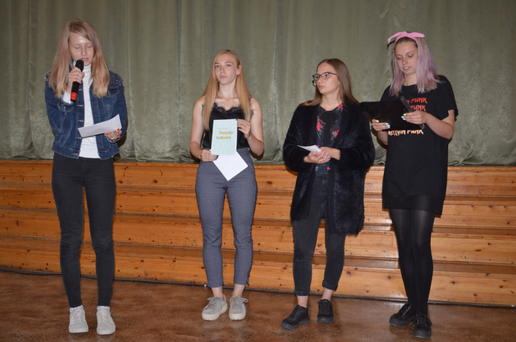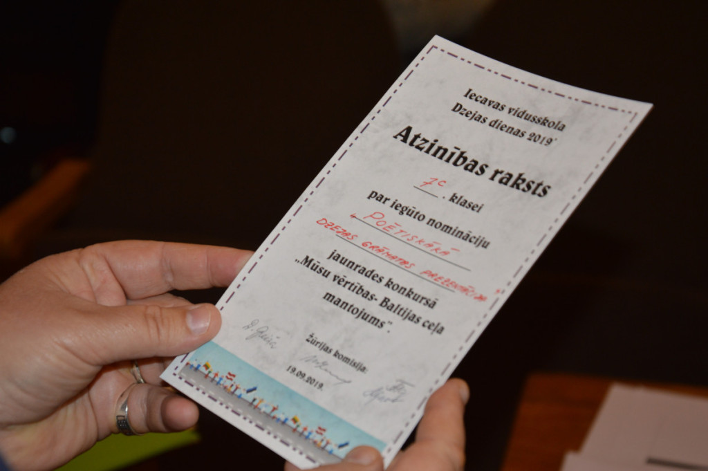 Dzejas dienu pasākumā 5.-12. klašu kolektīvi prezentēja savus dzejoļu krājumus, kas veltīti Baltijas ceļam un vērtībām, kuras saistās ar šiem 30 gadus senajiem notikumiem. Visbiežāk atskanēja tādi vārdi kā drosme, vienotība, spēks, Baltija, Latvija. Arī dzejas grāmatu noformējumā bija skatāmi simboli, kas liek domāt par tautai un valstij svarīgām vērtībām. Dzejas krājumu vizuālo tēlu vērtēja skolotāja Olga Petrišina, savukārt skolēnu prezentācijas uzklausīja skolotājas Dace Greiža, Maruta Lasmane un skolas muzeja vadītāja Aldonija Gaveika. Emocionāls brīdis bija skolēnu sadošanās rokās, tādējādi izdzīvojot Baltijas ceļa kopības sajūtas un izmērot, kādu daļu no vēsturiskajiem 670 km varētu izveidot. Rezultāts- tikai aptuveni 310 m- lika padomāt par Baltijas ceļa akcijas vērienīgumu. Paldies par emocionālajiem brīžiem jaunrades darbu autoriem kā arī skolotājas K.Kareles audzēknēm M. Zakarītei, P.Albužei, L.Potašai, A. Krūzmanei, D.E. Beitiņai , kas papildināja pasākumu ar skanīgām dziesmām.