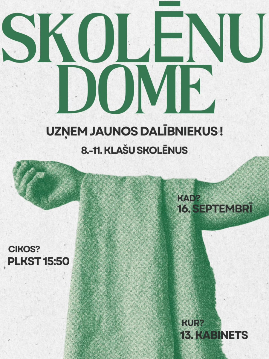 Ja ej 8.-11. klasē un vēlies dalīties ar savām idejām pasākumu organizēšanā, skolas dzīves uzlabošanā un citos aktuālos jautājumos, nāc un piesakies!