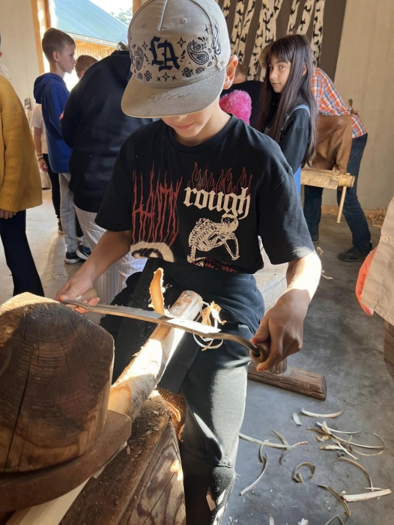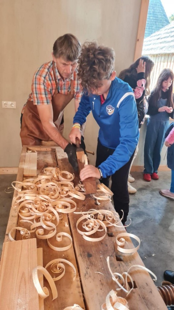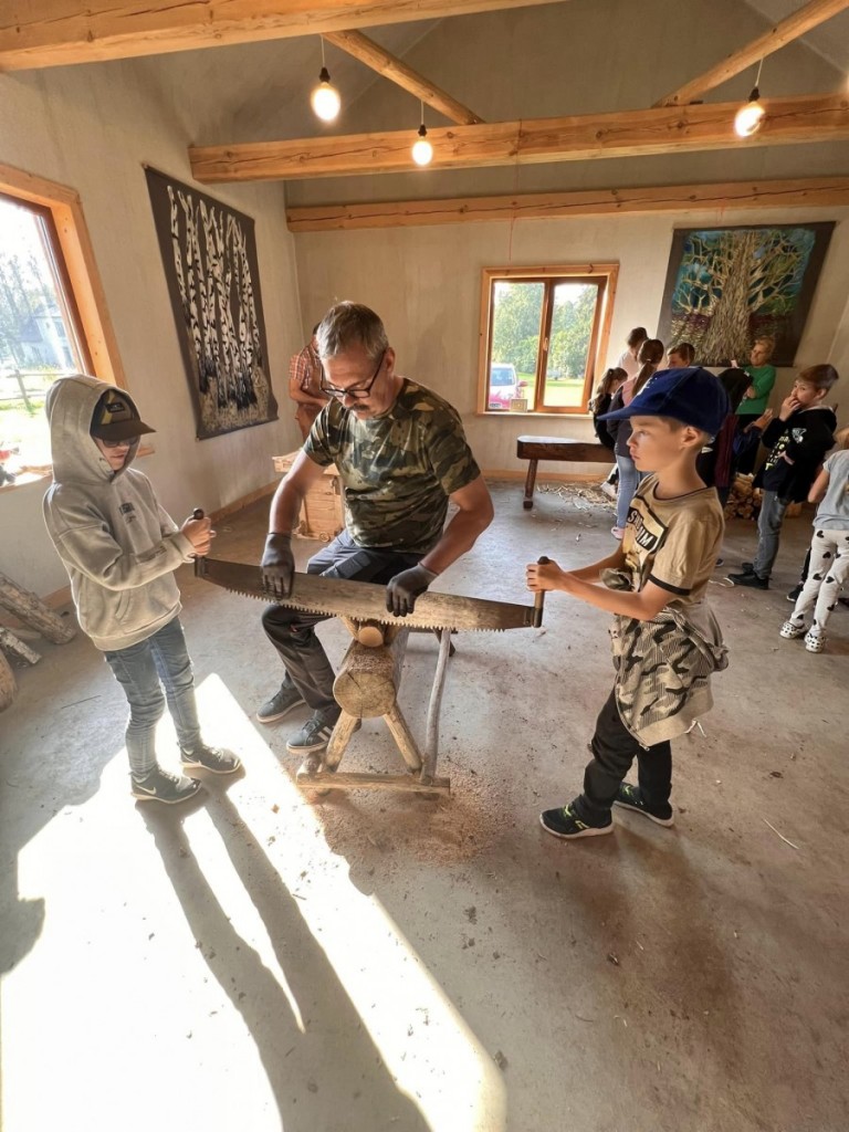 Namdara darbnica. Skolēni nostiprināja savas zināšanas par koku veidiem un to īpašībām, praktiski darbojās, zāģējot, ēvelējot un kaļot.